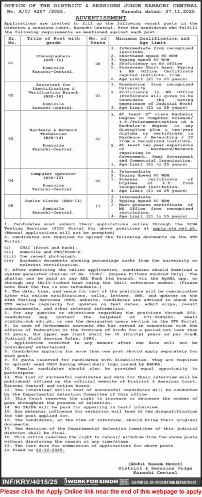 Marking a modern shift, the application process for Karachi District Court jobs in December 2025 is expected to be fully online. This streamlined approach makes it easier for candidates from across Sindh to apply.